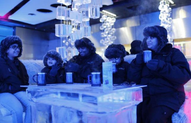Ou desfrutar de um chocolate quente enquanto está sentado em blocos de gelo, no meio do deserto