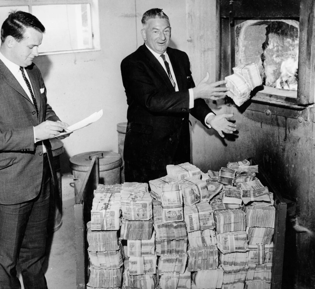 Eric Vallance do Banco de Reserva da Nova Zelândia queimando notas de libra esterlina, 19 de julho de 1968. A Nova Zelândia havia mudado recentemente para uma moeda decimal.