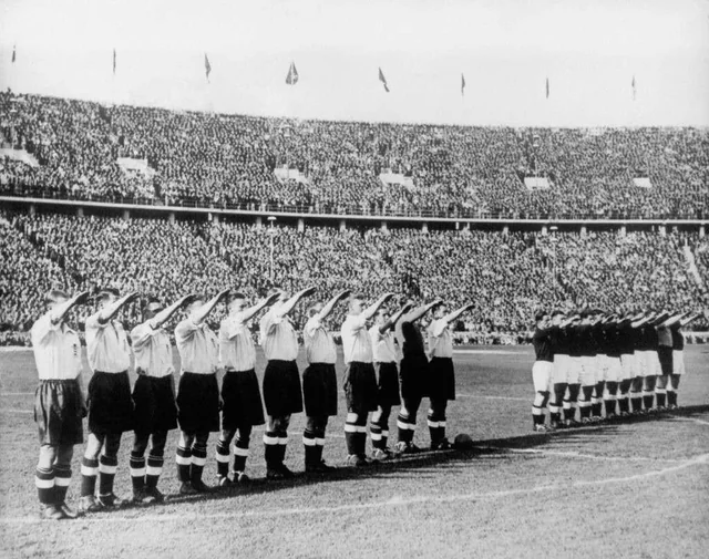 As seleções de futebol da Inglaterra e da Alemanha durante a execução do hino nacional alemão antes de uma partida. A Inglaterra venceu por 6-3, maio de 1938