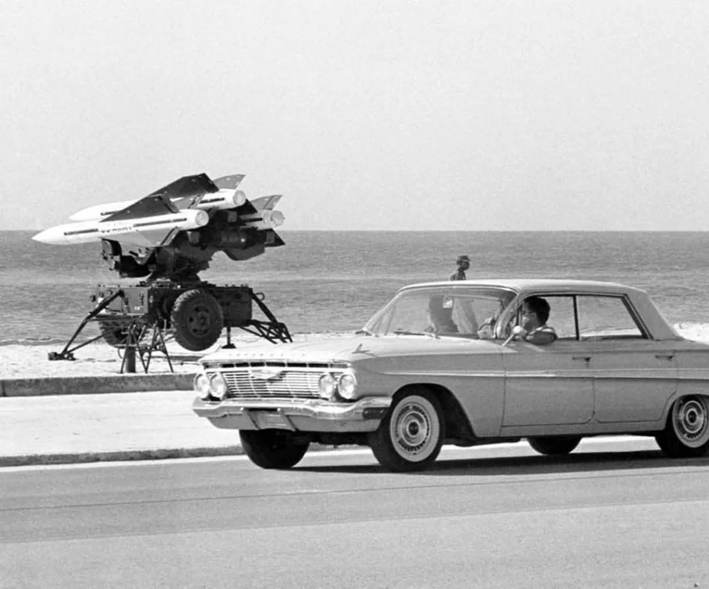 Mísseis antiaéreos do Exército dos EUA montados em lançadores e apontados sobre o Estreito da Flórida em Key West, Flórida, 27 de outubro de 1962.