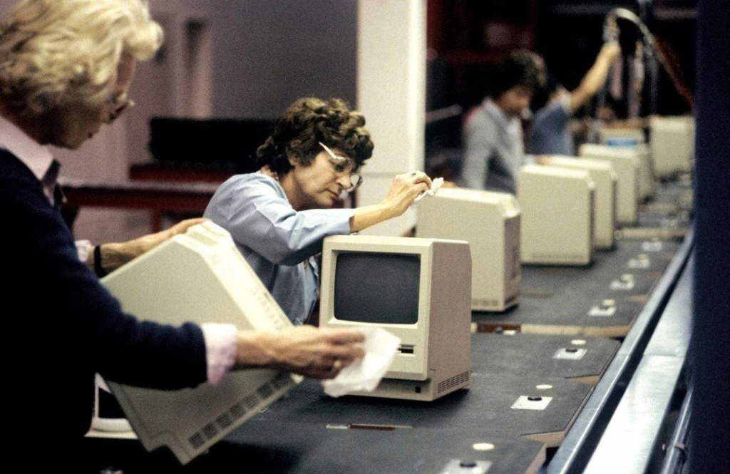 Os computadores all-in-one da Apple são montados na fábrica da empresa em Cupertino, Califórnia, em 25 de janeiro de 1984.