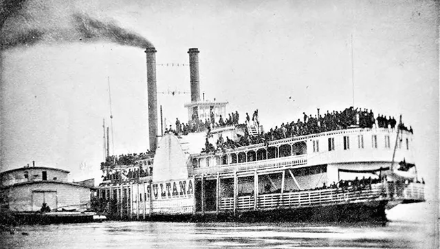 O barco a vapor SULTANA, no rio Mississippi, superlotado com aproximadamente 2.400 soldados da União voltando para casa no final da Guerra Civil Americana. Suas caldeiras explodiram às 2 da manhã e afundou perto de Memphis, matando cerca de 1.860 pessoas. Helena, Arkansas, abril de 1865