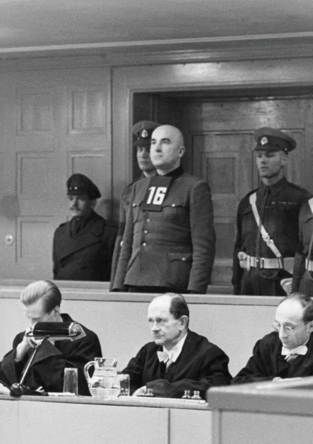 O dentista alemão Martin Hellinger em pé enquanto é sentenciado a 15 anos de prisão por crimes de guerra por um tribunal militar britânico. Ele removeu o ouro dental de prisioneiros mortos em um campo de concentração. Após sua libertação, o governo da Alemanha Ocidental pagou a ele 10.000 DM em compensação, 1946