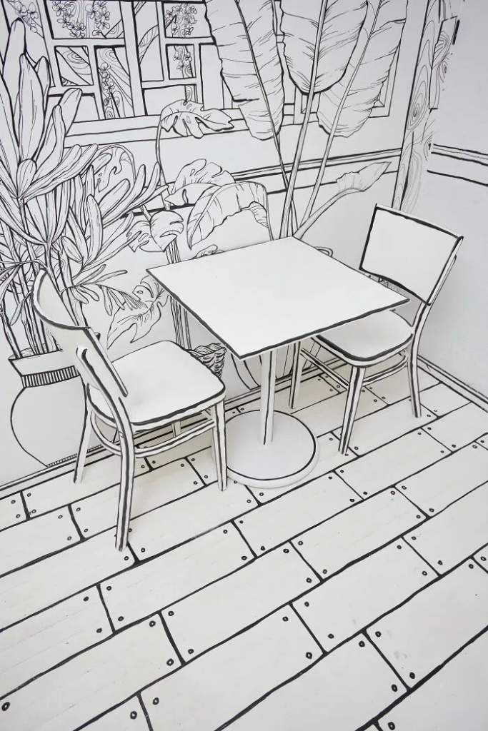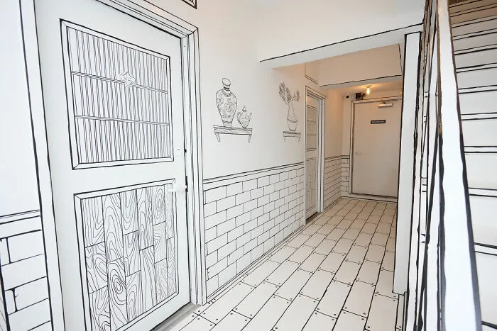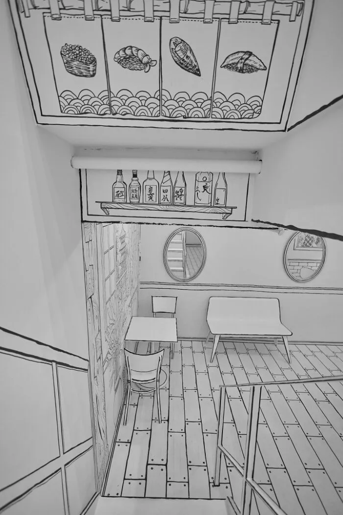 O restaurante Shirokuro, localizado no bairro East Village, em Nova Iorque, oferece uma experiência gastronômica única: um ambiente totalmente monocromático que simula estar dentro de um desenho. Cada superfície — paredes, chão, mesas e cadeiras — foi cuidadosamente ilustrada à mão em preto e branco, transformando o local em uma espécie de página de livro de arte em 3D.