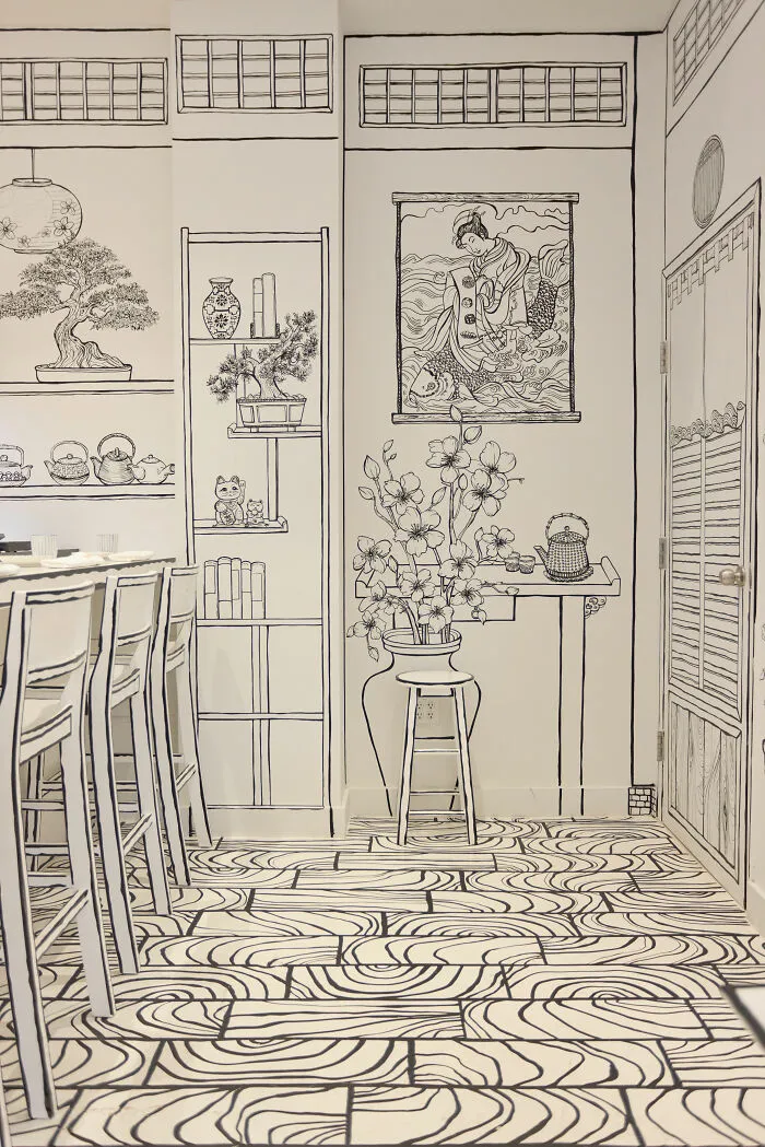 O restaurante Shirokuro, localizado no bairro East Village, em Nova Iorque, oferece uma experiência gastronômica única: um ambiente totalmente monocromático que simula estar dentro de um desenho. Cada superfície — paredes, chão, mesas e cadeiras — foi cuidadosamente ilustrada à mão em preto e branco, transformando o local em uma espécie de página de livro de arte em 3D.
