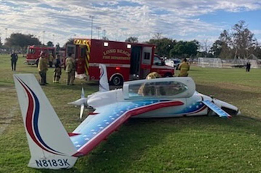Uma mulher surda escapou de morte ao ser atingida por um pequeno avião personalizado que caiu sobre ela enquanto passeava com seu cão em um campo de futebol em Long…
