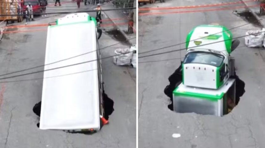 Um caminhão de entrega de refrigerantes foi parcialmente engolido por um buraco em uma rua de Iztapalapa, na Cidade do México. O incidente ocorreu no último sábado (13), quando a…